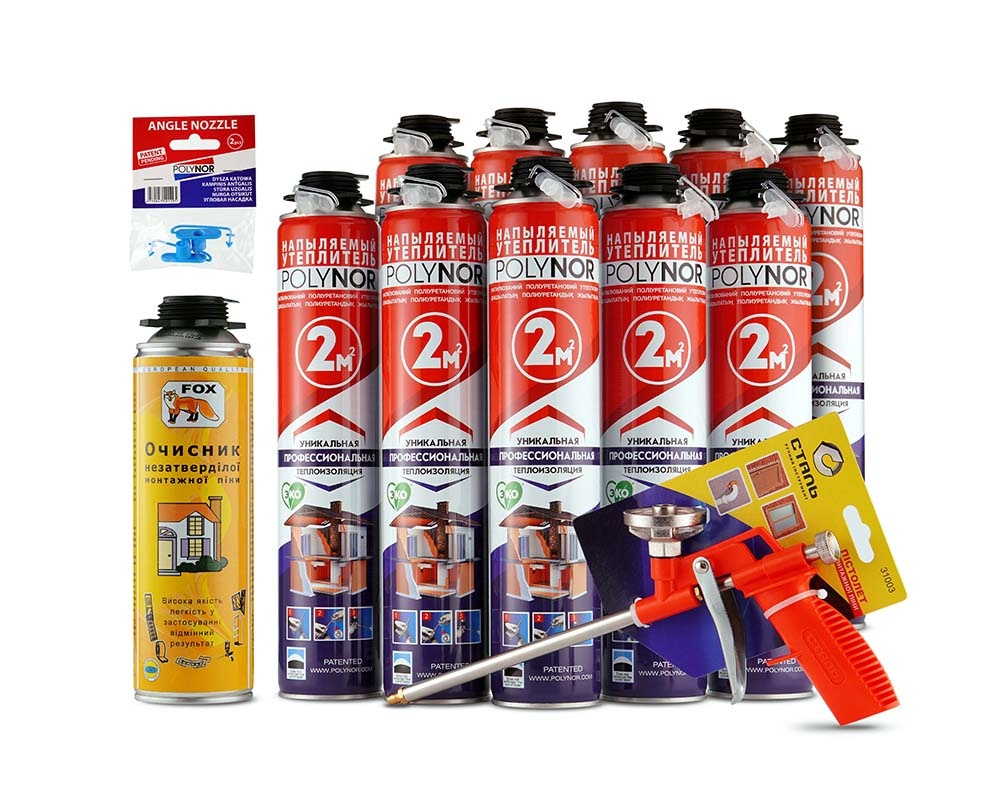 Полінор - 10 шт., Кутові насадки - комплект з 2 шт., Пістолет для монтажної піни - 1 шт., Очисник для монтажної піни - 1 шт.