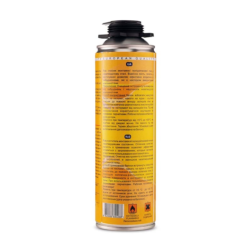 Очищувач не затверділої монтажної піни необхідно зберігати чи транспортувати при температурі від +5 до +30 °C у вертикальному положенні. Не допускати потрапляння УФ променів та нагрівання балонів понад +50 °C. Заборонено використання біля джерел вогню.